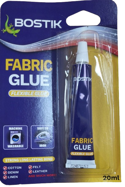 Bostik Fabric Glue has a low odour, is easy to use and easily washes off fingers. It can be used for clothing (hems, trouser turn-ups, pockets, and repairing worn sleeves), labelling (attaching cloth labels & badges to children’s’ clothes), laces (when lace ends fray, put a drop of Bostik Fabric Glue on your finger and quickly roll on to the end of your lace), furnishings (taking up curtain hems, attaching pelmets and decorating soft furnishings), tears (repair torn fabric using a patch, apply Bostik Fabric Glue to the inside of the garment and to the patch then smooth into place), and buttons (a drop of Bostik Fabric Glue applied to buttons stops them unthreading)